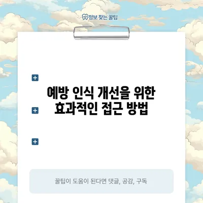 교육 프로그램 개발 : 예방 인식 개선을 위한 첫 단계는 교육입니다. 다양한 형태의 교육 프로그램을 통해 사람들은 예방 조치의 중요성을 이해하고 실천할 수 있습니다.정보 제공 : 건강 관련 정보는 쉽게 접근할 수 있어야 합니다. 정확하고 신뢰할 수 있는 정보를 제공하고, 이를 통해 사람들은 올바른 결정을 내릴 수 있습니다.커뮤니티 참여 : 지역사회의 참여는 예방 인식을 높이는 데 큰 역할을 합니다. 커뮤니티 이벤트나 캠페인을 통해 사람들은 예방의 필요성을 느끼게 됩니다.사회적 지원 시스템 구축 : 예방을 강화하기 위해서는 사회적 지원이 필요합니다. 이를 통해 개인들은 더욱 쉽게 예방 활동에 참여할 수 있습니다.